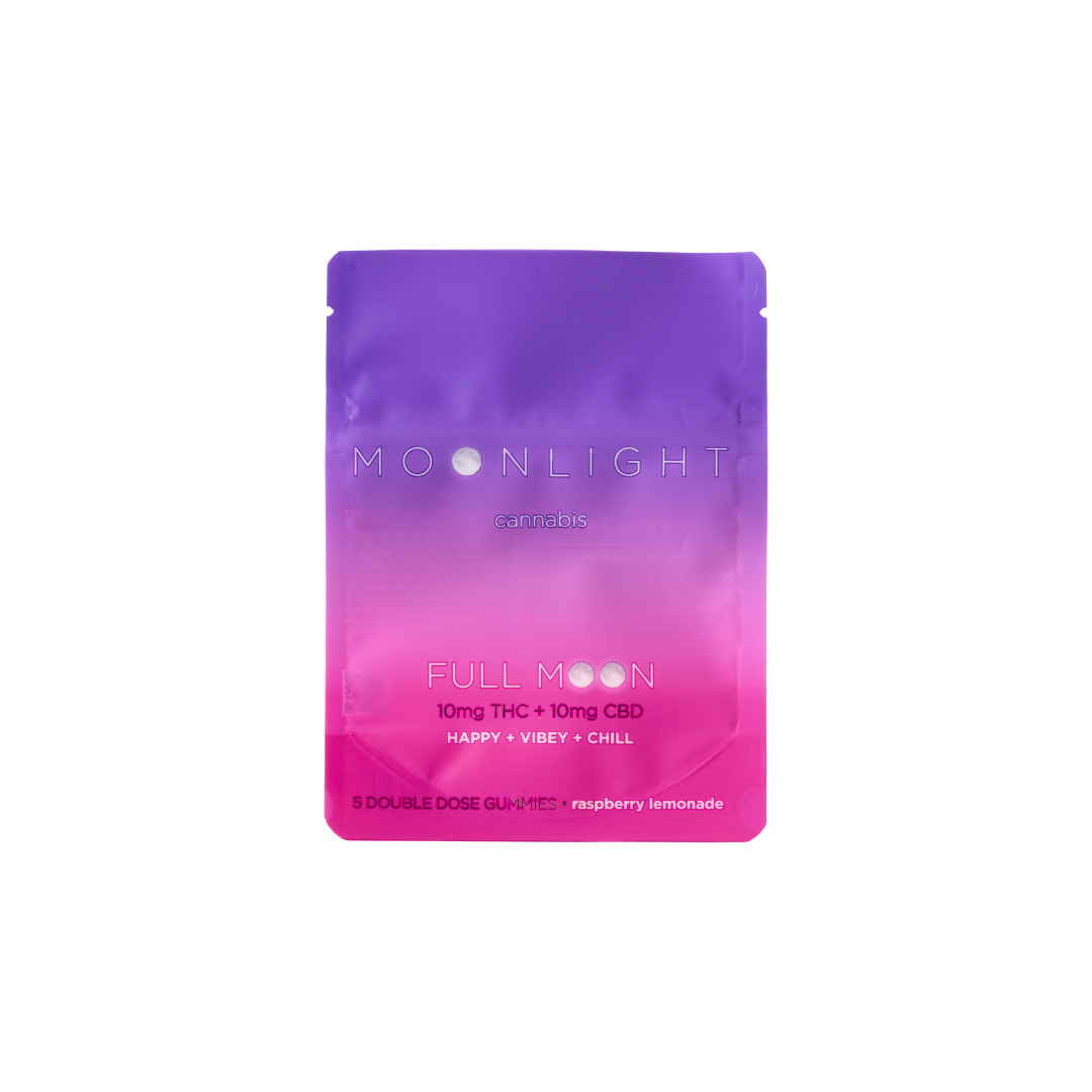 Full Moon is a line of hemp-derived edible gummies containing 10 mg of Delta 9 THC and 10 mg of CBD. Full moon is a double dose of the 5mg standard, legal dosage in MN. It’s the same happy and relaxing feeling—just more. Full Moon is for the edible connoisseur. The combination of Delta 9 and CBD was designed to make you happy. It’s like a warm hug. Pop one of these and snuggle up for a movie, take a stroll or zen out.Â